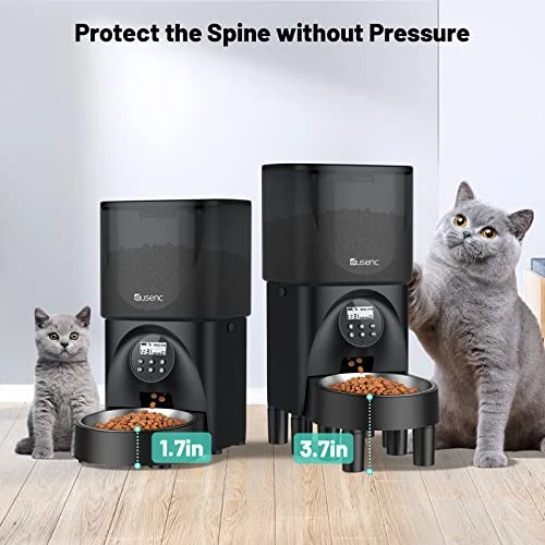 - Elevated Feed Bowl: The automatic cat feeder has 2-inch height feet, you can choose a 1.7-inch/3.7-inch feeding bowl. Using an elevated automatic feeder helps to reduce the pressure on the pet’s neck when eating, suitable for kittens/adult cats.