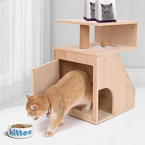 - 【Sturdy & Stylish】: Constructed with sturdy wood boards for added durability. The classic style works anywhere in the home, from the living room to your bedroom, an office, or wherever your pet needs a cozy cat cave. Surroundings of the cat houses & condos is made of sturdy boards. No matter how heavy the cat can jump and play freely.