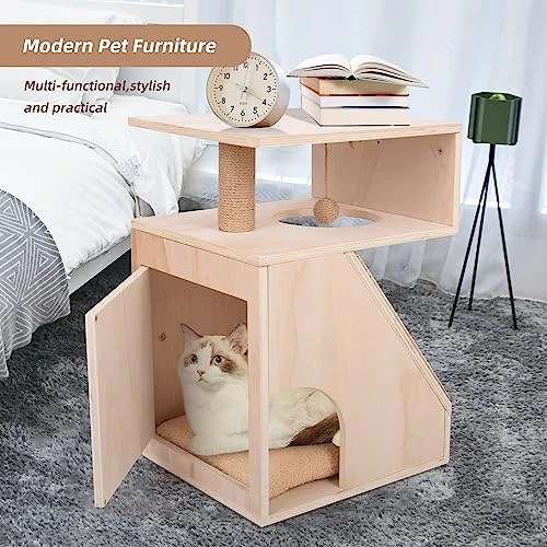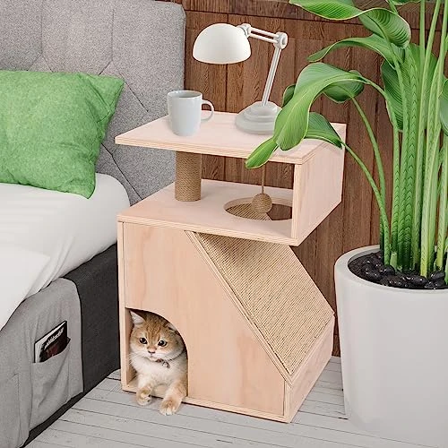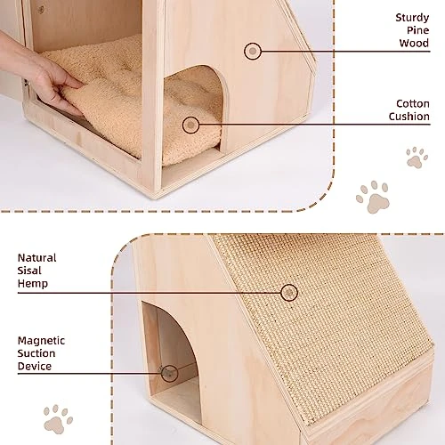 - 【Pet Safe Design】: Cat hideaway made from natural wood. This large cat house is equipped with a durable sisal scratching post,scratching pad and hanging ball to keep your cat engaged and happy.