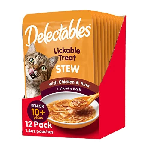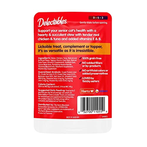 - MANY USES: These delectable cat treats can be used as a quick cat snack or a cat food topper to entice finicky eaters. Hartz Delectables Lickable Treats for Senior Cats are also available in stew, savory broths, chowder, soft pate, and squeeze ups.