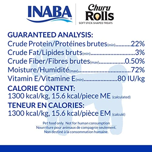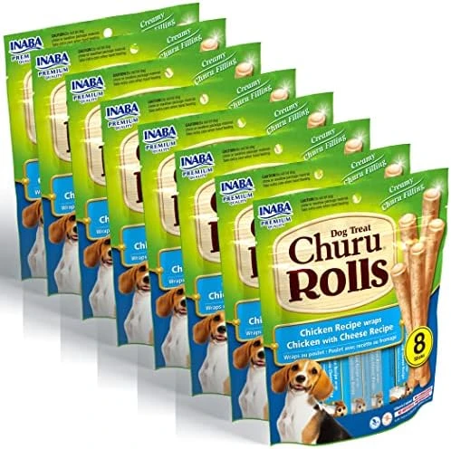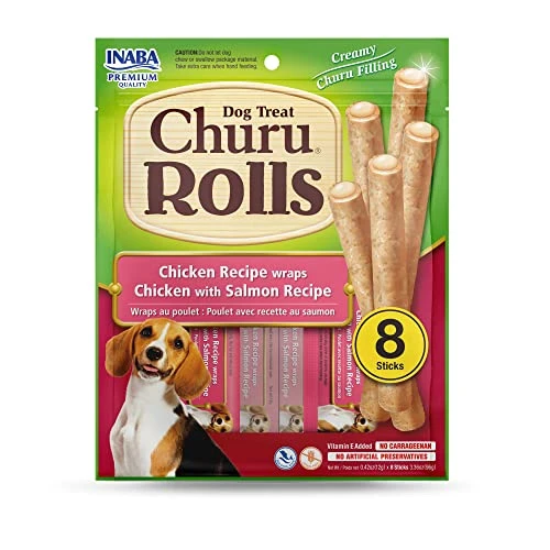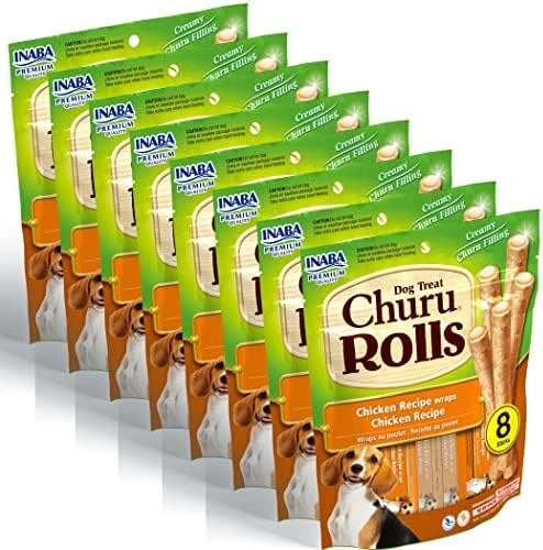 - TWICE THE TEXTURE: Each chewy stick starts with a soft baked chicken paste with no grains, preservative, carrageenan or artificial colors. Then we’ve filled the centers with Inaba’s delicious Churu filling to give your pup two types of texture