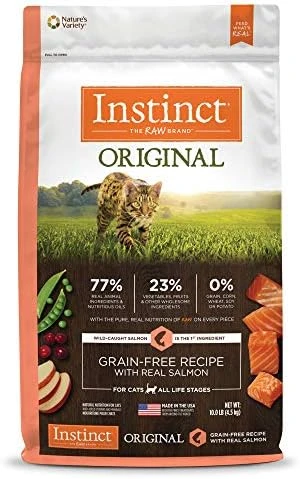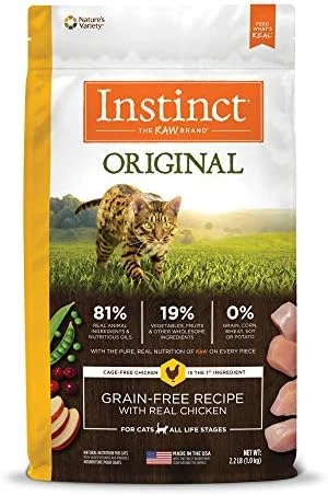 - NATURAL CAT FOOD: Instinct Original dry cat food is high protein cat food made with probiotics to support healthy digestion and omegas for skin & coat. Made without grain, potato, corn, wheat, soy, by-product meals, artificial colors or preservatives.