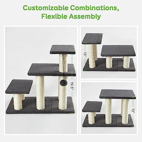 - Easy to Assemble & Customize: The 3-step (19.5 inch high) cat scratching post can be converted into two different 2-step (13.0 inch high) stairs by disassembling and reassembling them, meeting your pet’s needs for different heights. Pawque provides detailed assembly instructions to make assembly easier. Just remember to start from the top when assembling it