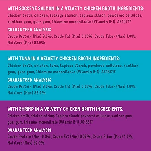 - A velvety broth adds yummy flavor to the three recipes in our adult cat food complement variety pack