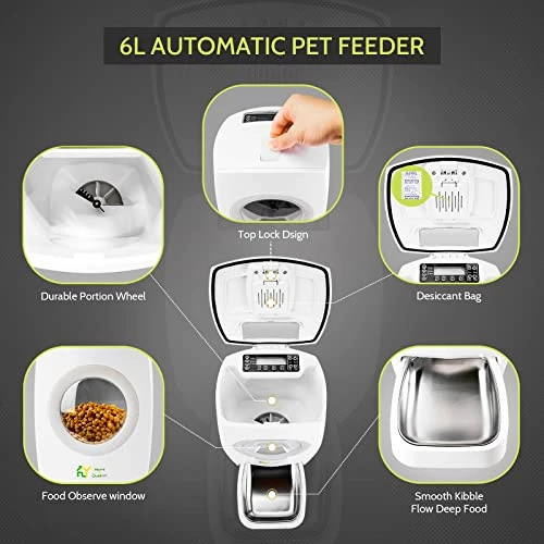 - Suitable Capacity: This 6L cat feeder automatic consistently feed your cat and dog smoothly for a couple of day, assuring you that it’ ll stay full and happy when you’re out for a short vacation or work long hours as well as come with a desiccant bag to keep food fresh.