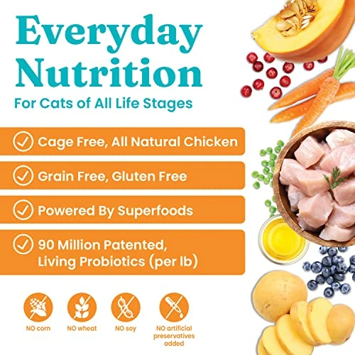 - Prebiotic & Probiotic Support for Feline Digestive Wellness – This high protein cat food features prebiotics and patented live probiotics that support digestion, gut flora, and immune system support for cats.