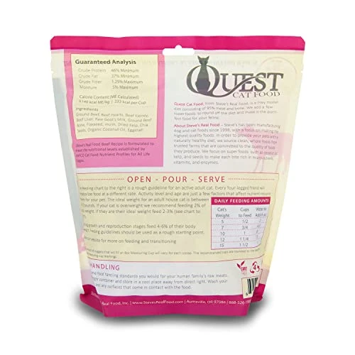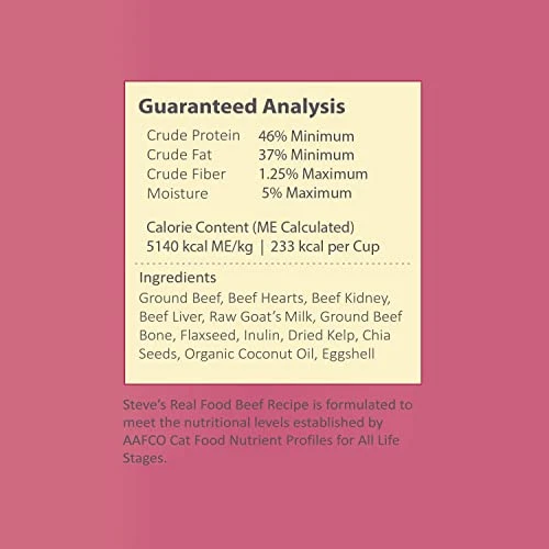 - What’s in the Bag – Each diet is 95% of the highest quality meat, organ, and bone. The remaining 5% consists of all natural, value-added ingredients, each serving a unique purpose. The result is a food that best imitates an incredibly healthy diet of cats in wild. Each 10oz bag has about 6 cups of dry food which makes about 2 pounds of food once it is re-hydrated.