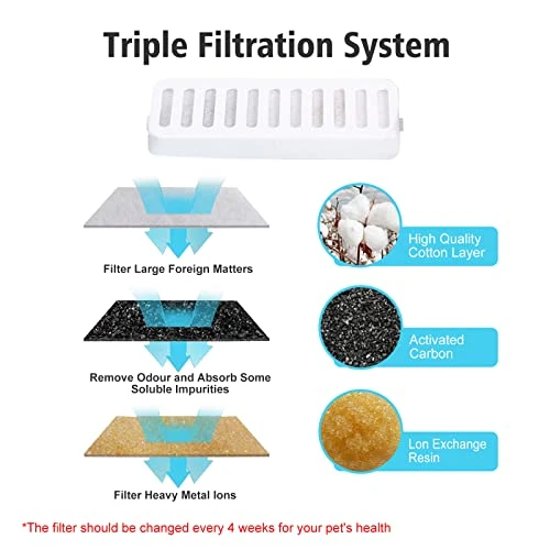 - 【Triple Filtration Pet Fountain】This dog fountain’s recirculation filtration system uses filters consisting of activated carbon, ion exchange resin and microporous filter cotton. Removes odors, softens water, and removes impurities such as hair, dirt, and food particles to provide your pets with fresh water throughout the day.