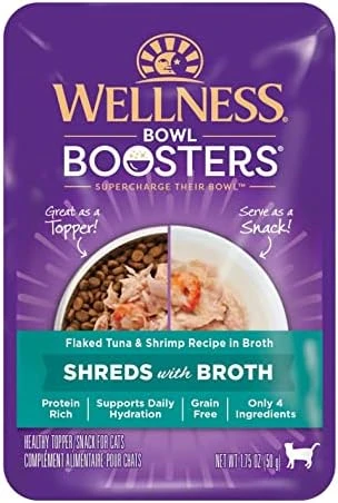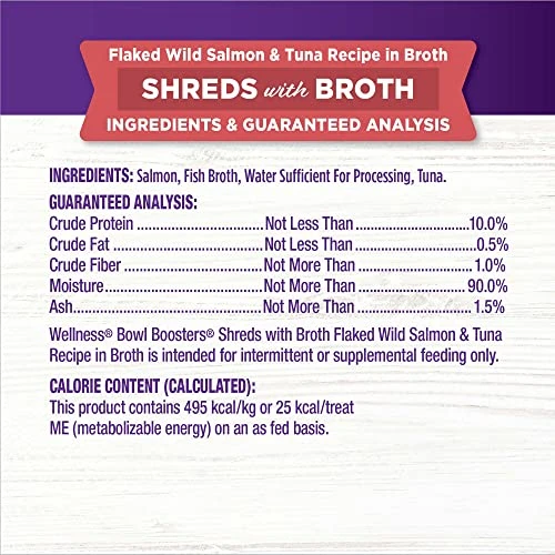 - FLAKED WILD SALMON AND TUNA: Crafted with only four natural ingredients, the grain-free and filler-free cat food topper features flaked salmon and tuna in a savory broth to satisfy even the most refined palates.