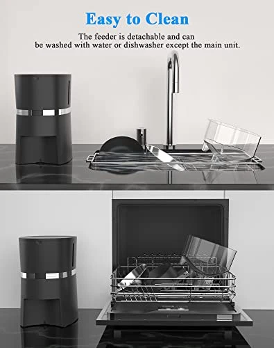 - 【Easy to Use & Maintain】inbuilt food shortage alert light allows for quick fullfill and the manual feeding option for additional feedings, Proper food bowl angle so that food will not accumulate in the food outlet, Detachable 304 stainless steel bowl and Detachable BPA-free hopper for easy cleaning. The safety lock prevents your pet from opening the lid to steal food.