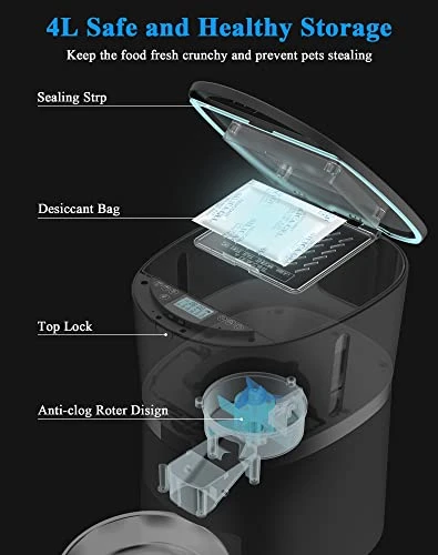 - 【Personalized Recordings】You can record 10s of personalized recordings to remind your pets before meals. Stay close with your pet even you’re not at home. You can also disable the sound for your smart pet to have a good sleep on the weekends. The pet feeder come with a desiccant bag to keep food fresh.